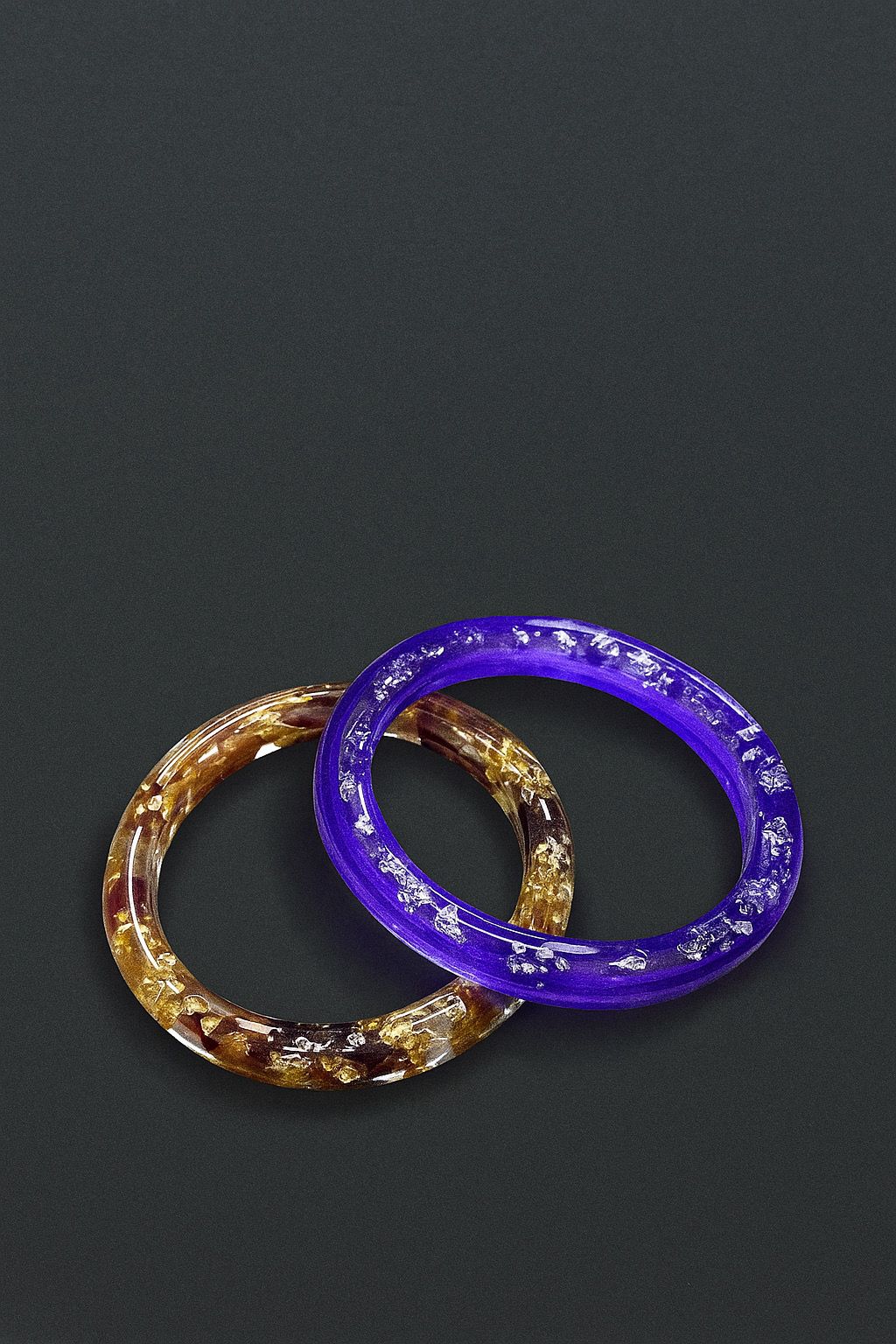 Elevate your accessory game with this stunning set of handcrafted resin bangles. Featuring one translucent purple bangle with shimmering silver foil flakes and another clear bangle infused with rich gold and copper-toned accents, this duo brings a perfect blend of modern charm and timeless elegance. Each piece is meticulously crafted to showcase the unique embedded elements, making every bangle a one-of-a-kind statement. Whether you’re dressing up for a special occasion or adding flair to your daily wear, these bangles are sure to captivate attention.